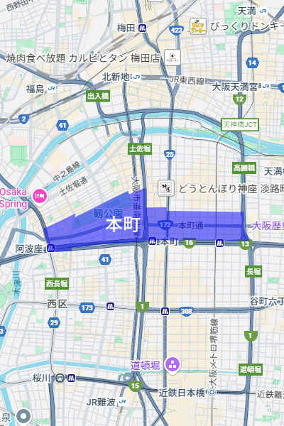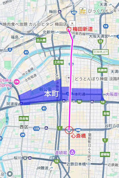 『雨の御堂筋』と言えば、1971年に発表された欧陽菲菲のデビューシングルです。 実は同年にザ・ベンチャーズが発表したインストゥルメンタル曲に歌詞を付けたカバーなんですが、一般的には欧陽菲菲の曲として認知されています。探し人の影を追って雨の中ひたすら歩くという内容で、歌詞の中に大阪の実在する地名が登場するのが特徴のご当地ソングです。 先日カラオケでこの曲を歌ったんですけど、歌詞の内容を想像していたら「ん?」と思うところがあり、ググってもそれに言及している言説が見当たらなかったのでちょっと書いておきたいと思いました。 (参考:『雨の御堂筋』の歌詞) 歌詞を先頭から順に重要ポイントをピックアップしながら見てみましょう。 「♪小ぬか雨降る 御堂筋」 小ぬか雨というのは霧のように細かい雨のことです。そんな雨が降っているんですね。 「♪こころ変りな 夜の雨」 時間帯は夜ですね。 「♪あなた あなたは何処よ あなたをたずねて 南へ歩く」 主人公は「あなた」を探して南方向へ歩いているようです。 「♪本町あたりにあなたはいると 風の知らせを背中で聞いて」 探し人に関する手掛かりが出てきました。本町あたりにいるそうです。ちなみに本町はこのあたり(ここでは安土町・南本町・靱本町・西本町も含む)です。 ![]() さてここからしばらく歌詞は主人公の状態や情景の描写がメインとなり、新しい情報もないため少し飛ばしまして、二番の後半、締めのAパートまでスキップします。 「♪梅田新道 心斎橋と 雨の舗道は 淋しく光る」 再び具体的な地名が出てきました。主人公は少なくともこの二地点間を、御堂筋沿いに南方向へ歩いたわけです。これを地図上で見るとこのルートになります。 ![]() なんで本町通り越して心斎橋まで行ったん? |